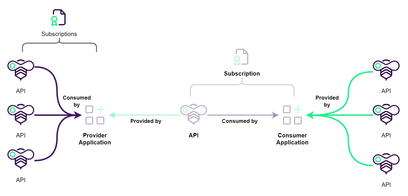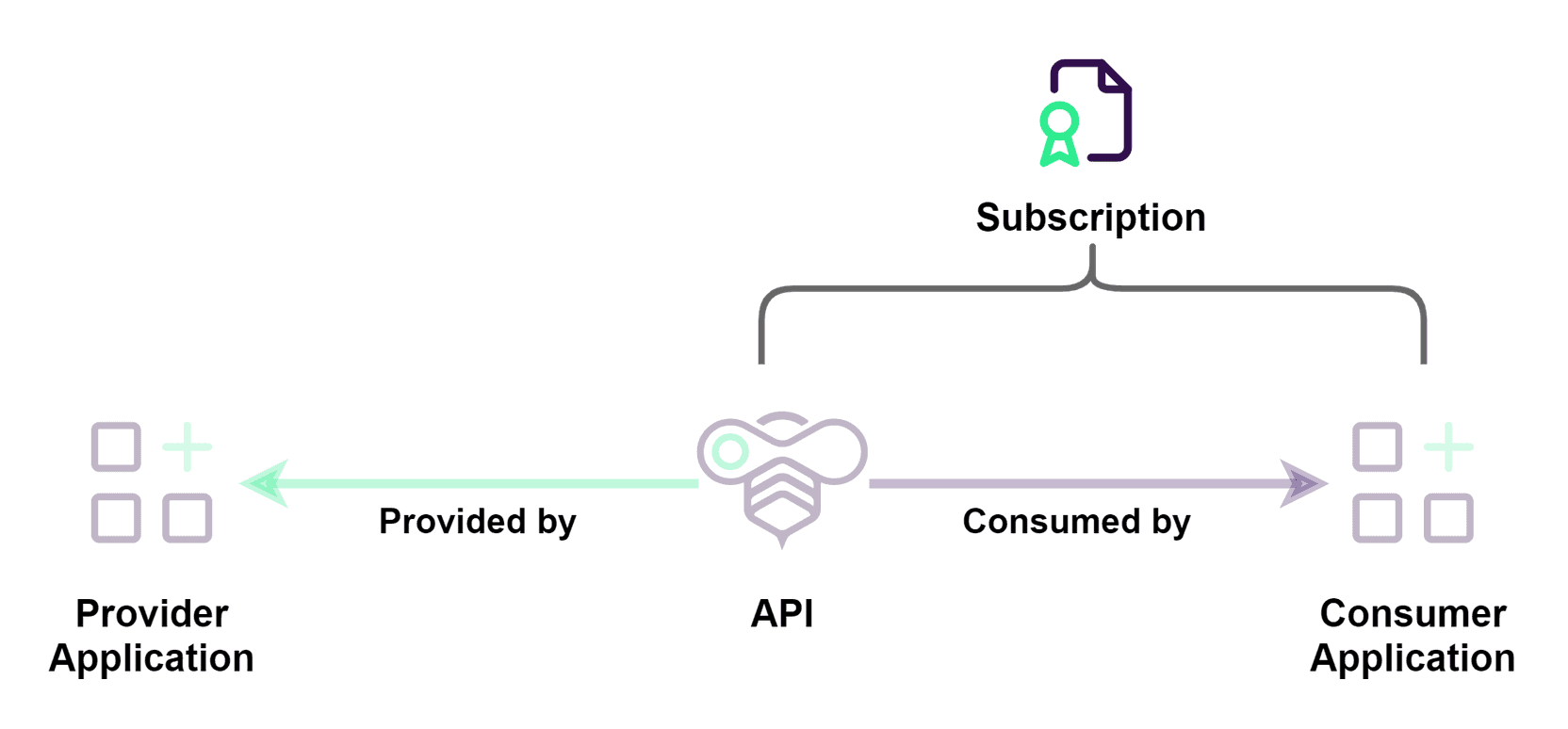 The Subscription acts as a contract that defines the relationship between a Consumer Application and an API. Therefore, a Subscription is created whenever an Application wants to be the Consumer of an API, which is in turn provided by another Application.