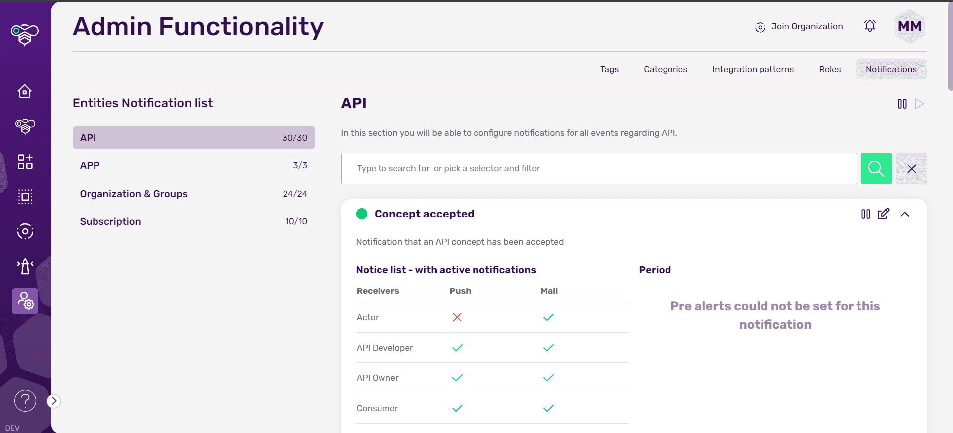 In ApiShare, the configurability aspect of notifications is as customizable as it gets. Within the dedicated admin section of the tenant, it is indeed possible to choose, for each type of role present within the ecosystem, not only which notifications this receives or not, but also whether to deliver them via email or as a push notification.