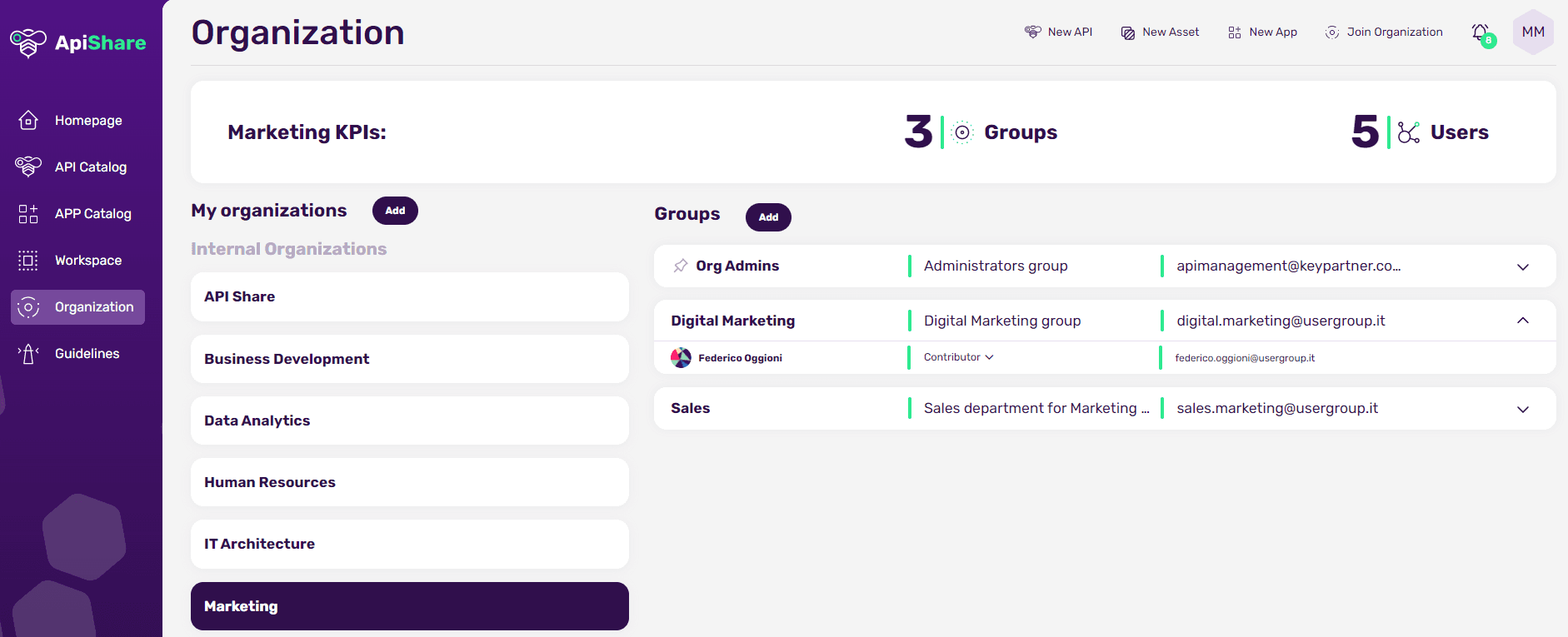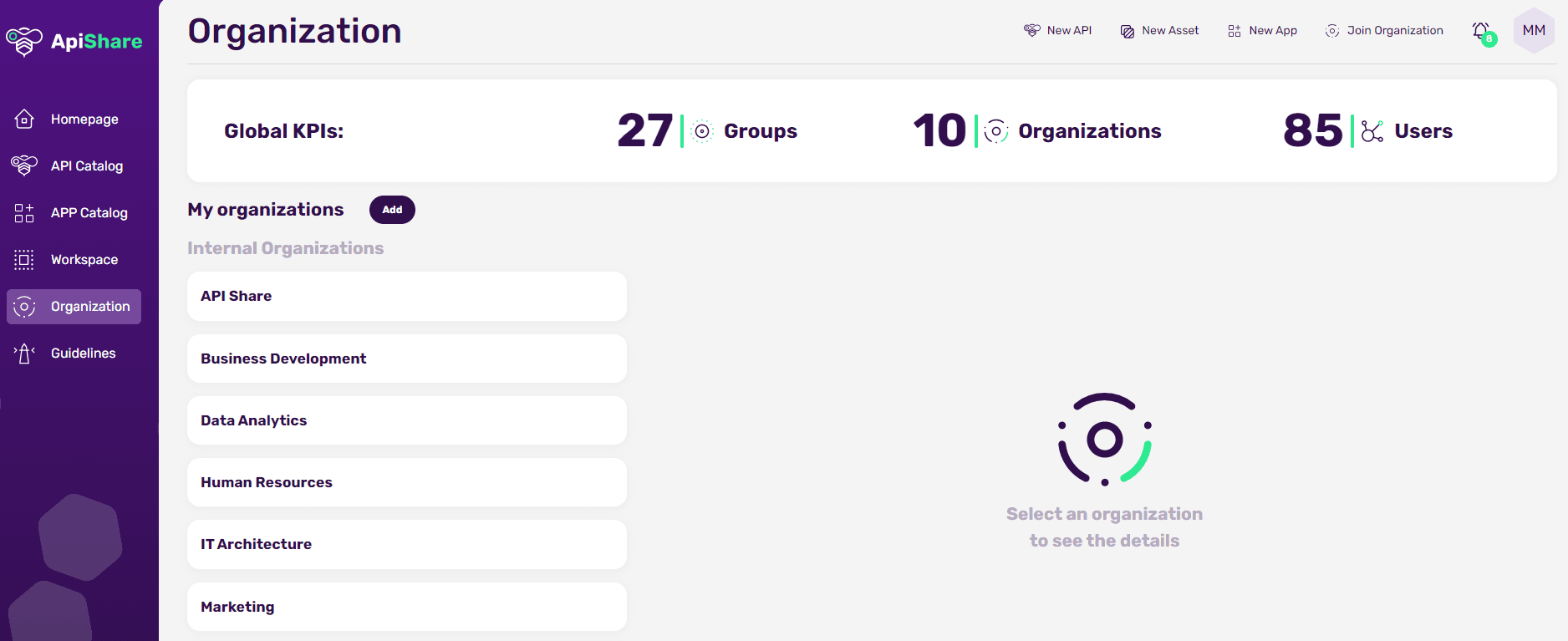 ApiShare help you organize your API ecosystem’s structure, by using Organizations, which represent the top-level units within which all stakeholders must be placed.