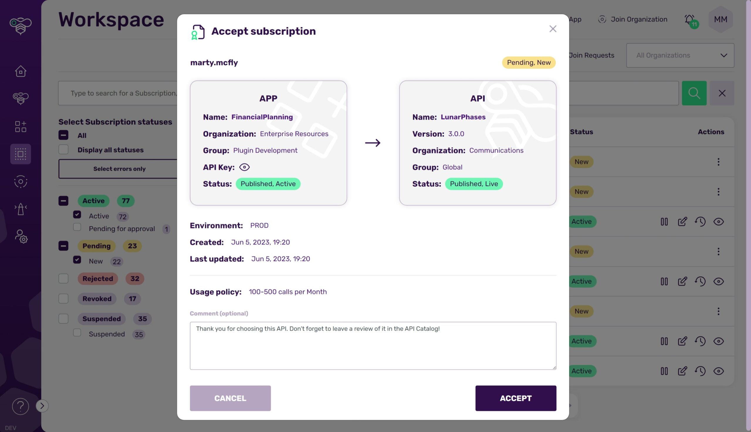 Last, the developer can optionally provide a set of use-cases for which their Application requires access to the API, before submitting the request. The API owner will then be notified of the request, and they’ll be able to easily assess the request, and approve or reject it with some comment.