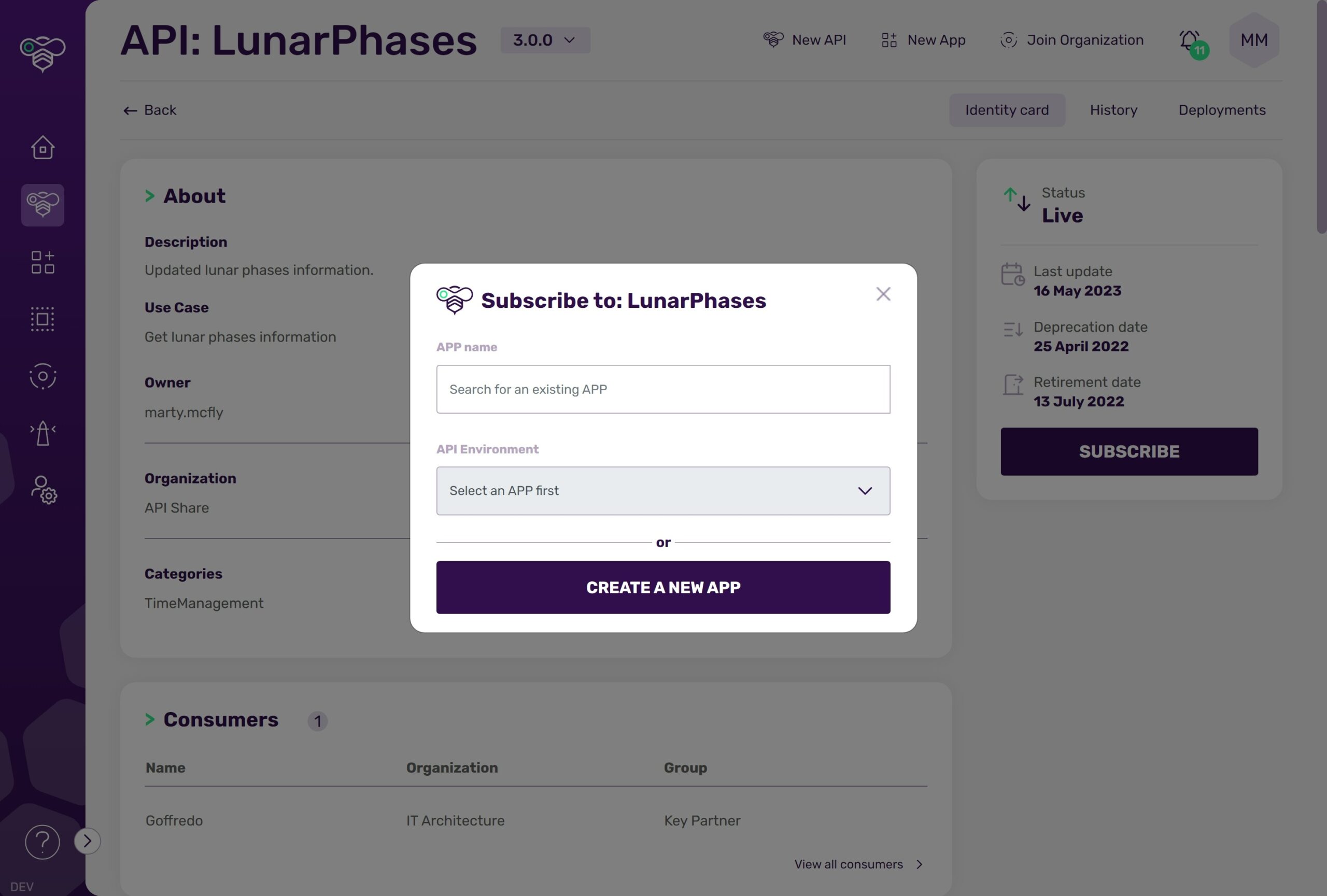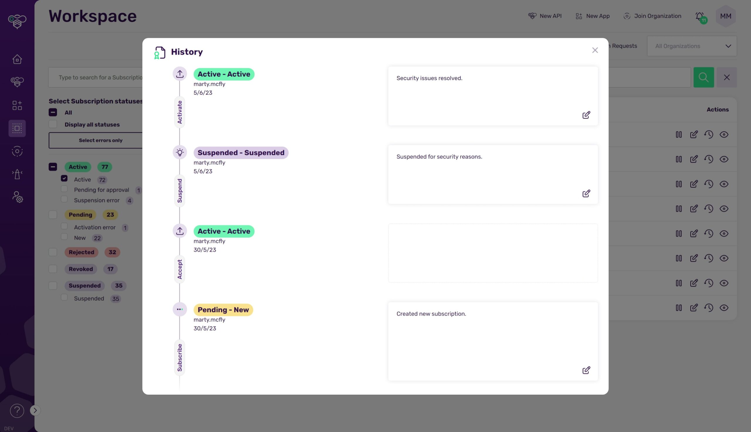 Once the API owner accepts the request, ApiShare will integrate with your Gateway (if configured) to set everything up automatically, without any manual intervention on the gateway, thus activating the Subscription. An active Subscription can then be quickly found, suspended, and eventually revoked once the consumer Application no longer requires it. Last but not least, a history of the subscription will always be available to keep track of the contract’s full journey and activity.