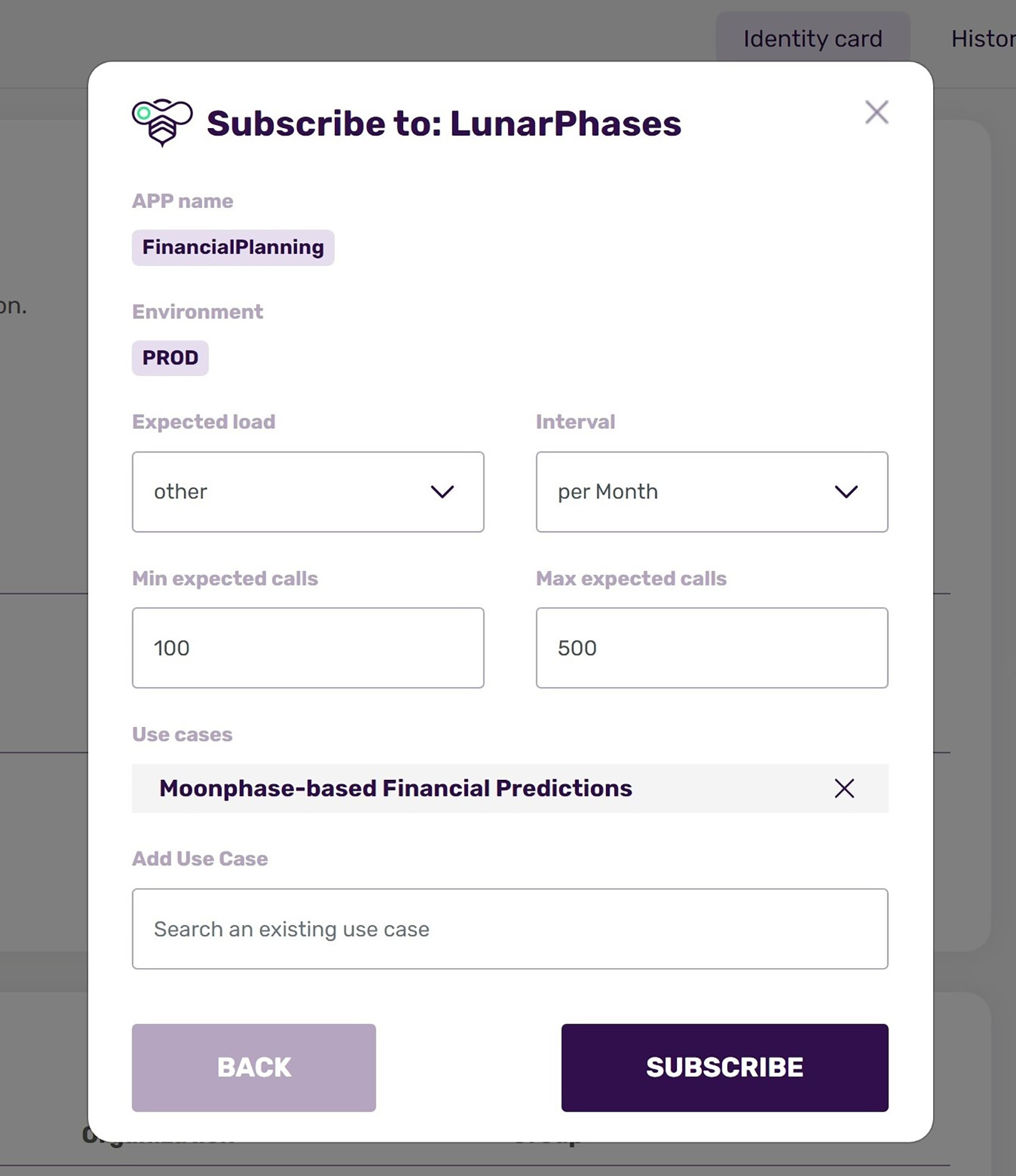 The Subscription form requires the developer to declare their consumer Application, as well as the destination environment of the API. (Access to different environments is determined by the user’s permissions.) Furthermore, the Subscription must include some estimate of the traffic their Application will generate.