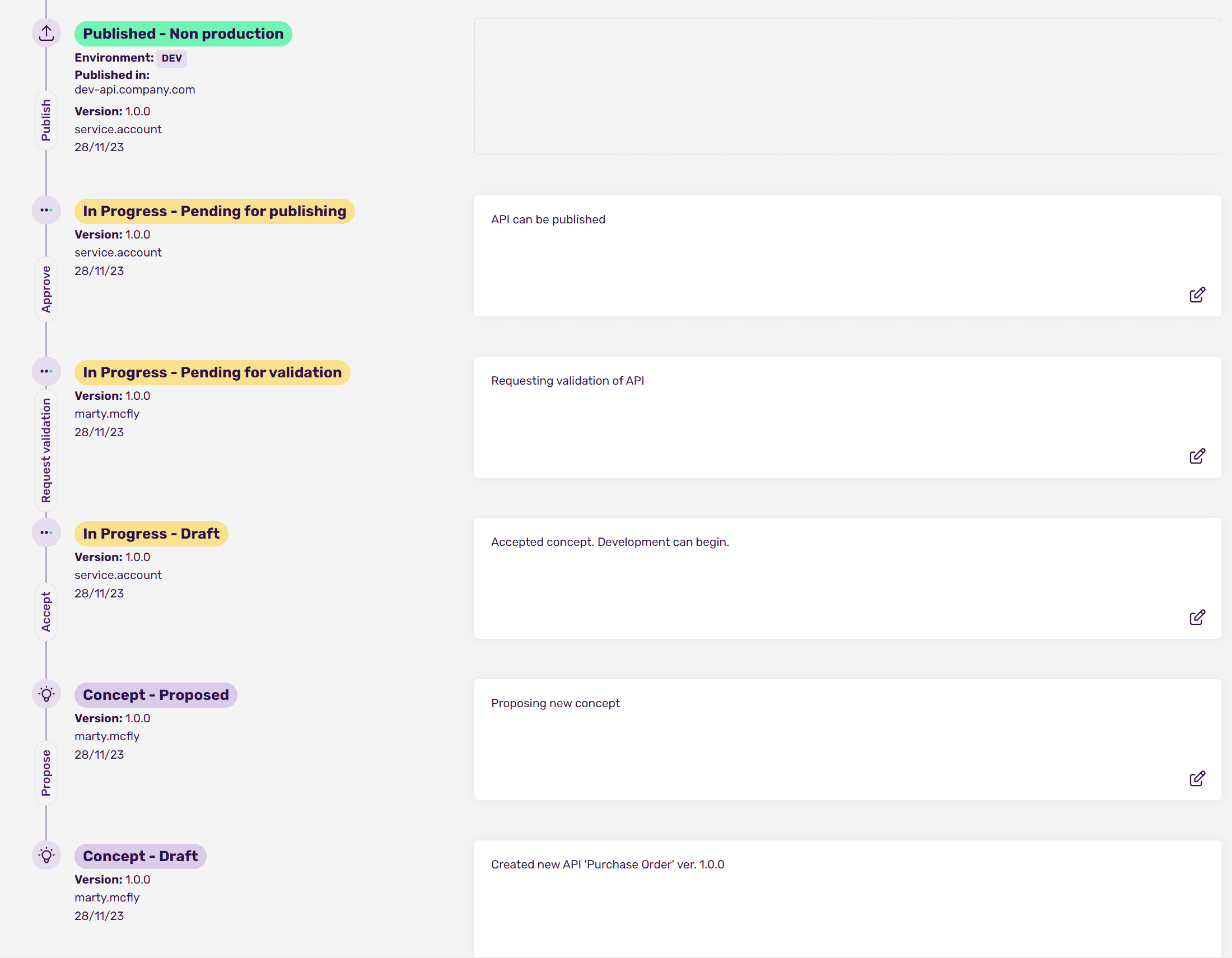 Aside for the more obvious information about where the API is deployed and how it can be used, proper governance suggest that a history of the lifecycle of an API should also be kept, and that’s exactly what ApiShare does, by keeping track of all the actions performed on an API and by whom, with comments besides.