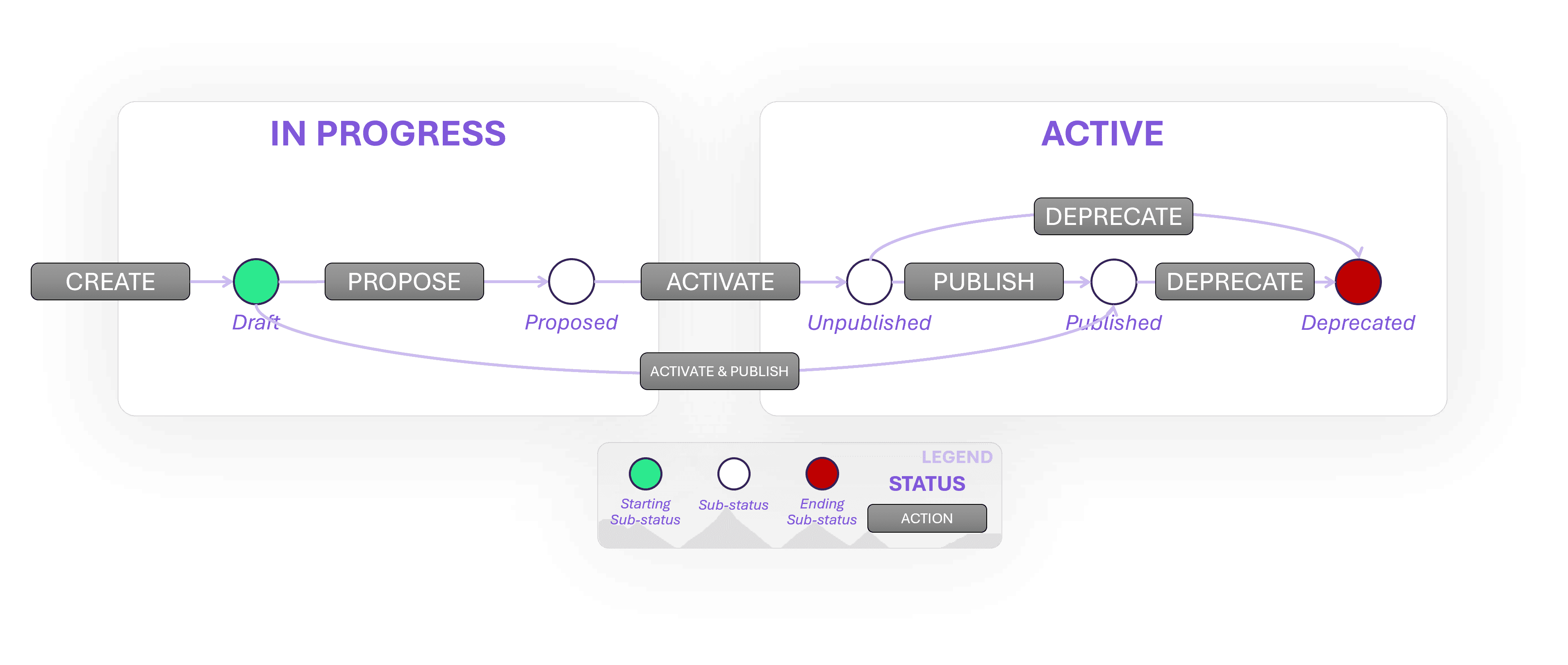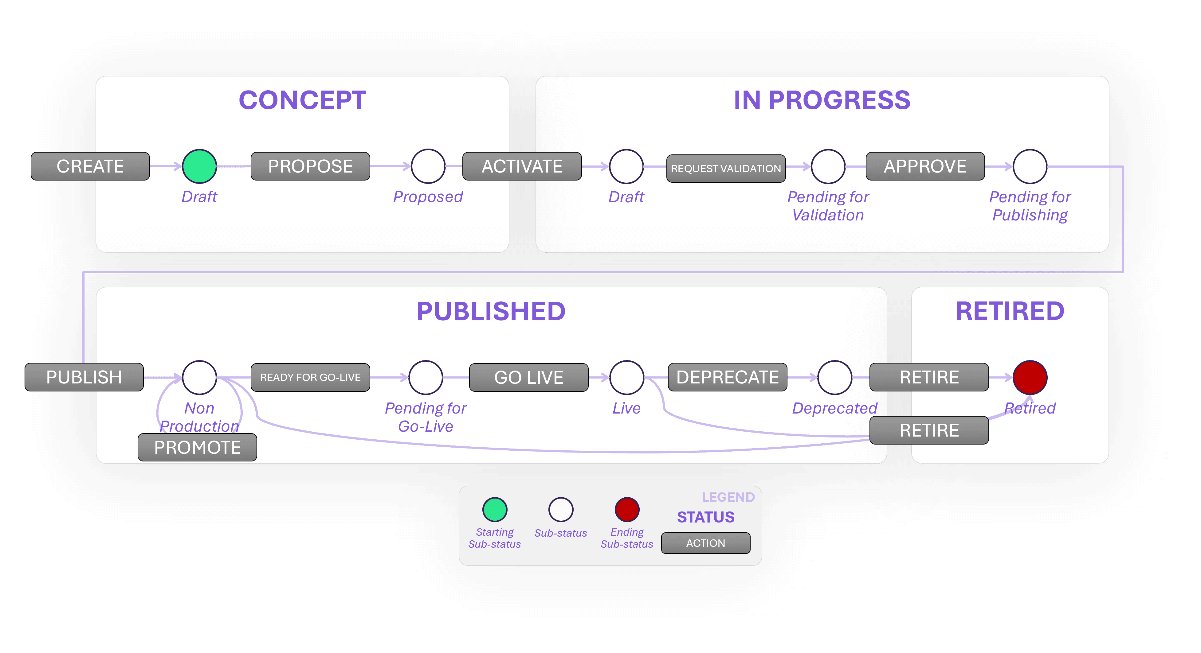 ApiShare assets follow a structured lifecycle that can be fully managed within the platform. This lifecycle is divided into macro-states, each with its own sub-states that provide further granularity to the asset's evolution.