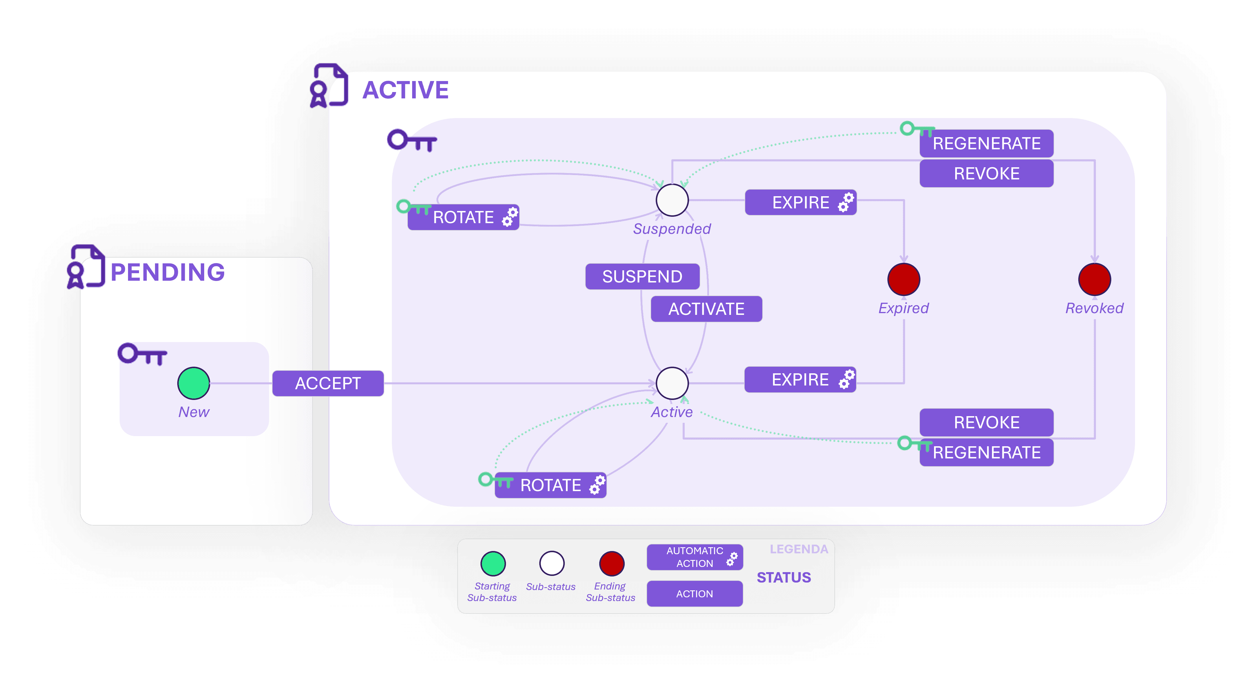 1. Pending → Active (Action: Activate): A new Key Set is created and becomes active.