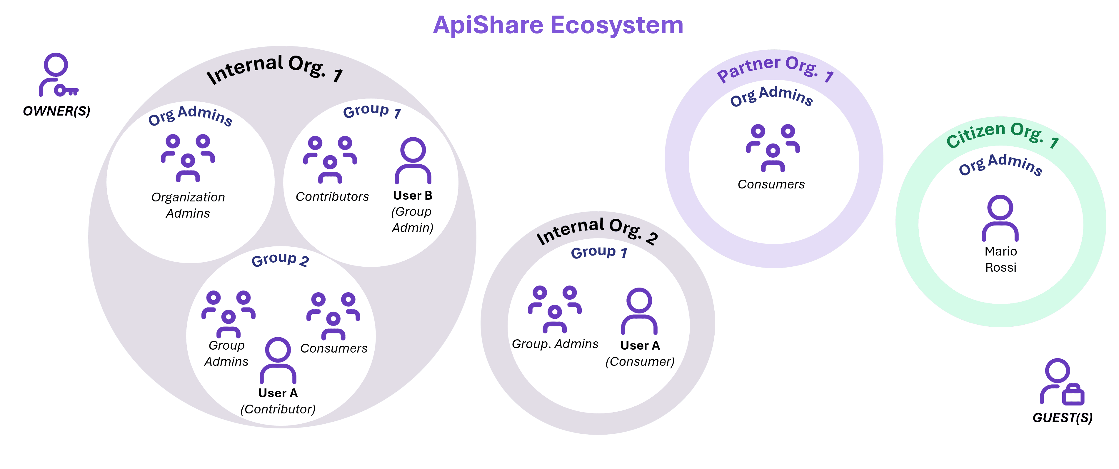 Internal Organizations: Represent business units within a company, managing proprietary APIs and applications. Members have structured access based on group roles and assigned permissions.