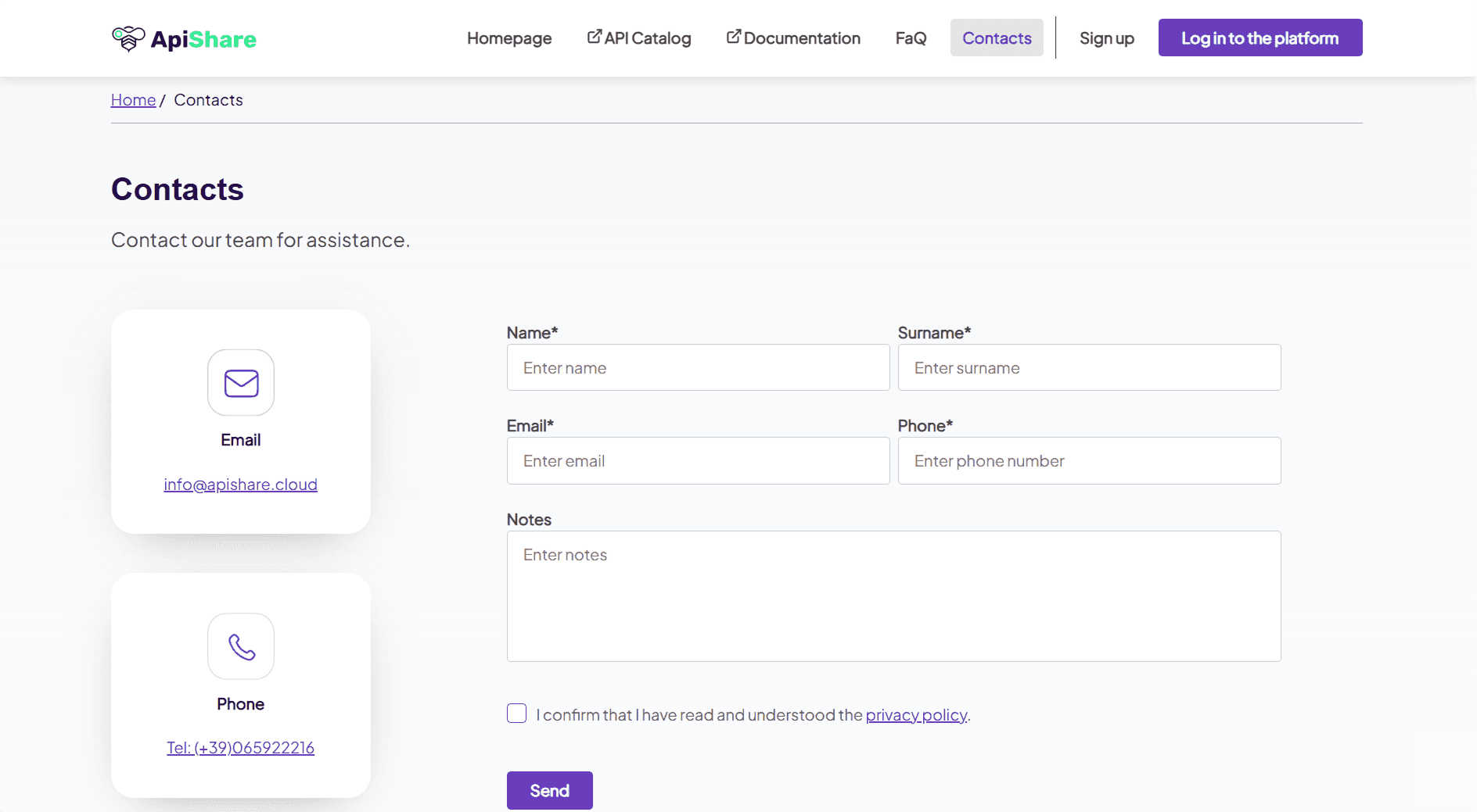 The Contacts section provides visitors with relevant contact information and includes a request form for additional inquiries. Customers can decide which contact details to make visible, ensuring that external users have a clear communication channel.