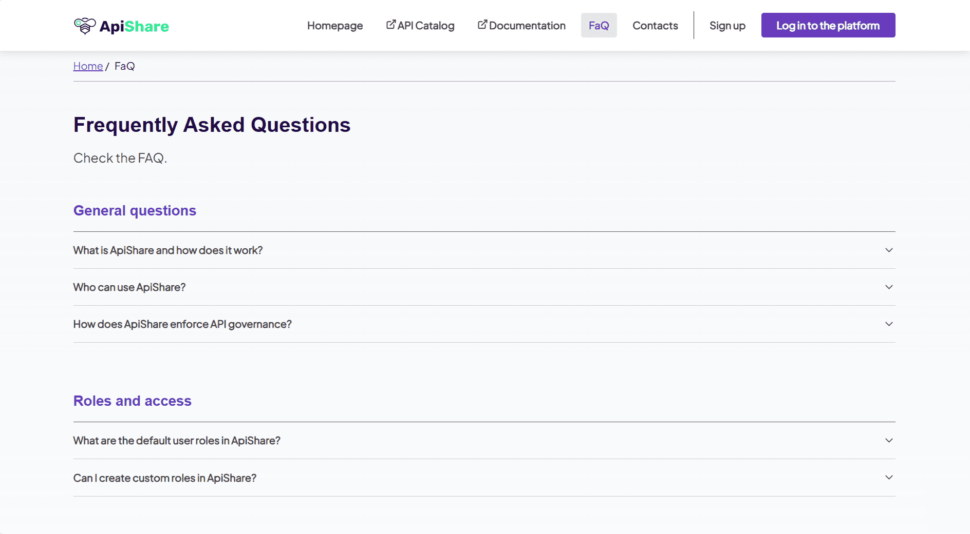 The Public Showcase feature in ApiShare provides customers with a customizable public space to present their APIs and related resources to an external audience. The content shown in this section is intended for illustrative purposes, providing an example of how APIs, documentation, FAQs, and contact information can be presented. The Public Showcase helps organizations promote their APIs and supporting materials to users who do not have direct access to the ApiShare platform.