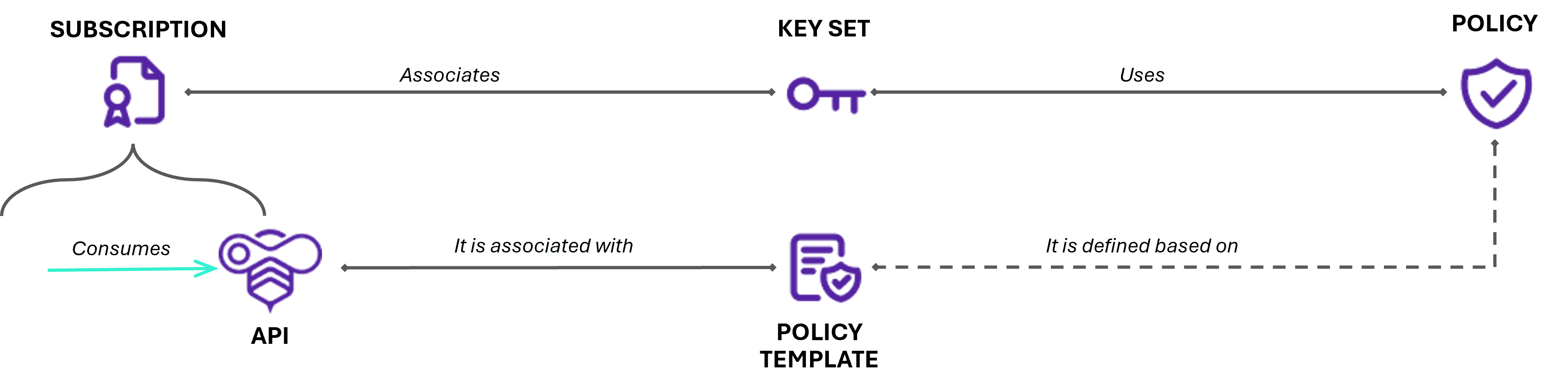 Each Subscription results in the assignment of a Key Set, which contains the credentials used to invoke the APIs. These Key Sets are generated automatically and governed by the associated Policy Template.