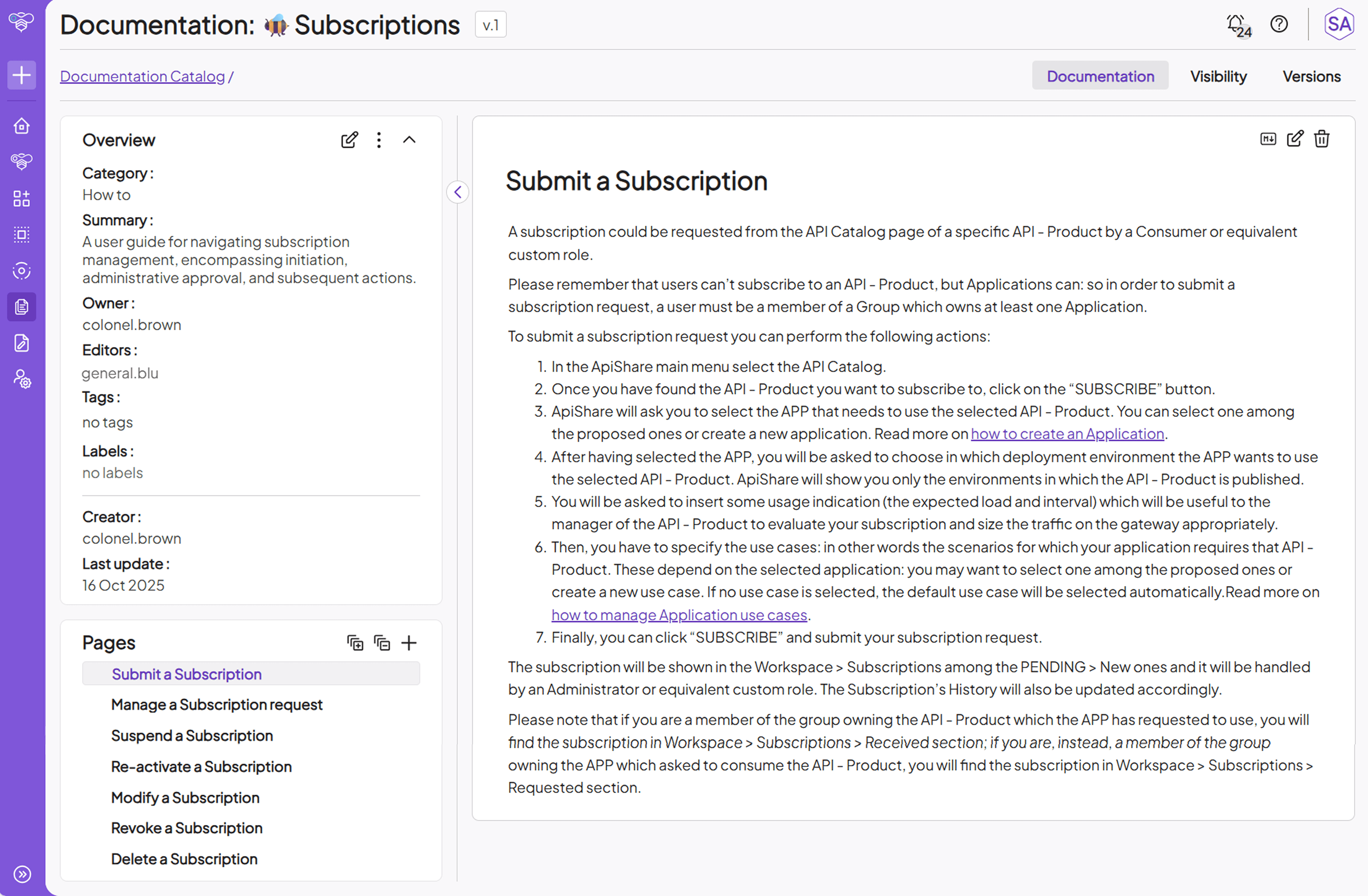 Each documentation entry in ApiShare is governed by ownership and role-based access controls: